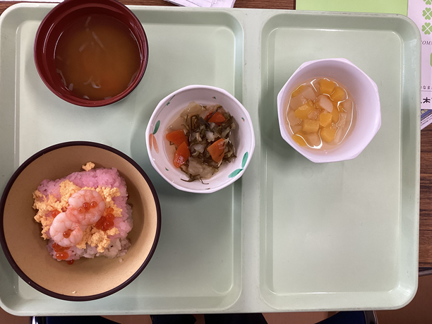 春らしい香りと彩りが特徴で、酢飯に桜風味の香りのちりめんじゃこを混ぜ込む事で、ほのかな塩味も楽しむ事ができます。具材には錦糸卵・サケ・エビ・穴子など見た目も楽しんでいただきました。