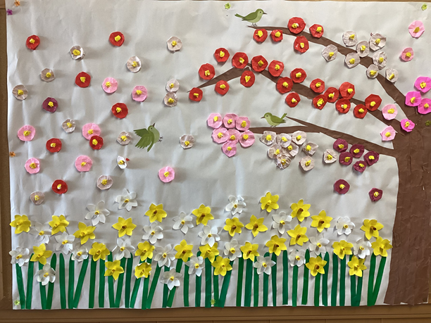 こちらは、冬から春にかけての壁面作品「水仙と梅」です。