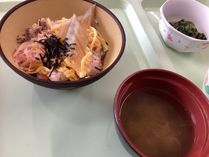 昼食では巻き寿司・稲荷寿司・ごぼうと鶏肉の炒り煮・マカロニサラダ・いわしのつみれ汁です。